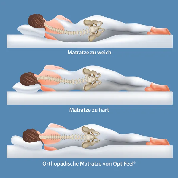 Die Wirbelsäule sollte sowohl in Seiten- als auch in Rückenlage ihre natürliche Form behalten. Um richtig zu liegen, muss das Schlafsystem an verschiedenen Stellen stützen oder nachgeben, damit die Wirbelsäule entspannt liegen kann.